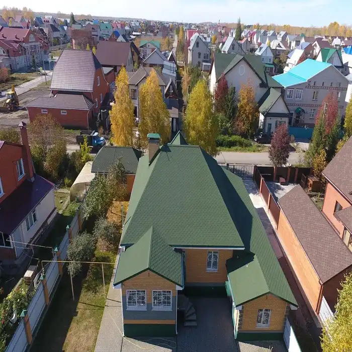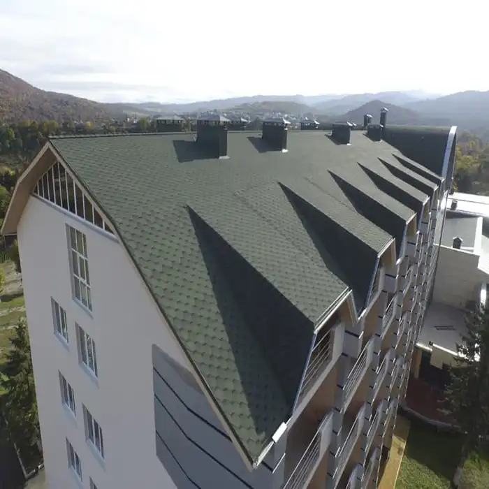 Гибкая черепица может применяться не только на малоэтажных жилых зданиях, но и при строительстве административных, жилых многоэтажных и других типов зданий.